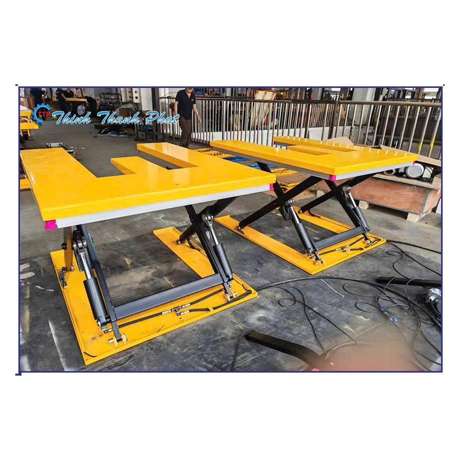 Thiết kế Chữ E: Mặt bàn được cắt khoét tạo thành hình chữ "E" (hoặc chữ "U" rộng). Phần không gian mở này được thiết kế để đón phần nĩa (forks) của xe nâng tay. Thiết kế này cho phép xe nâng tay đẩy pallet vào giữa bàn nâng mà không cần dùng lực nâng từ hệ thống thủy lực của bàn.