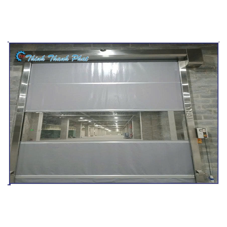 Về màn cửa (Curtain), vật liệu phổ biến là vải kỹ thuật Polyester phủ nhựa PVC có độ dày từ 0.9 mm đến 2.0 mm. Đặc tính của màn cửa này là khả năng chịu lực kéo cực tốt, chống rách, chống nấm mốc và kháng được nhiều loại hóa chất tẩy rửa thông thường. Bề mặt màn cửa nhẵn bóng, không tích tụ bụi mịn, giúp việc vệ sinh trong môi trường công nghiệp trở nên dễ dàng. Trên thân cửa thường được tích hợp các ô sổ xuyên sáng (Transparent Windows) bằng nhựa PVC trong suốt, giúp tài xế xe nâng quan sát được vật cản phía bên kia cửa, đảm bảo an toàn tuyệt đối khi di chuyển tốc độ cao.