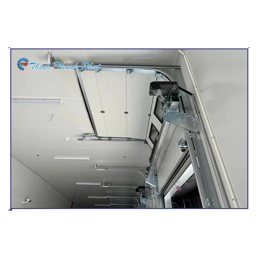 Cấu trúc Panel: Tương tự cửa trượt trần dọc, panel thường là loại Panel sandwich với lõi Polyurethane (PU) Foam mật độ cao, được bao bọc bởi thép mạ kẽm hoặc nhôm. Độ dày panel (40mm - 80mm) đảm bảo khả năng cách nhiệt và cách âm vượt trội, đạt hệ số truyền nhiệt (U-value) thấp, quan trọng cho việc duy trì nhiệt độ bên trong.